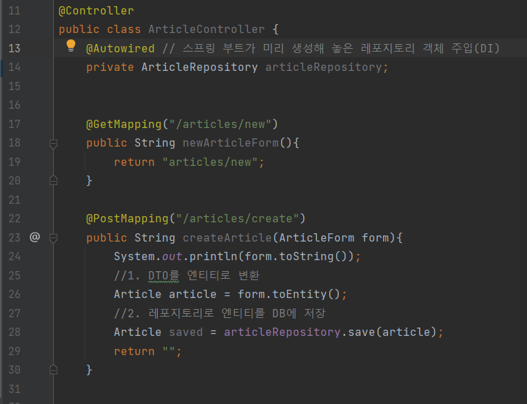 이번에는 앞에서 DTO로 받은 폼 데이터를 DB에 저장하는 예제를 실습해보겠습니다.