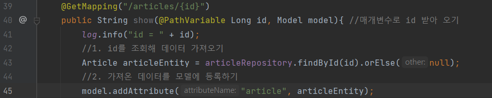 - 모델을 사용하기 위해서 show() 메서드의 매개변수로 model 객체를 받아옵니다.